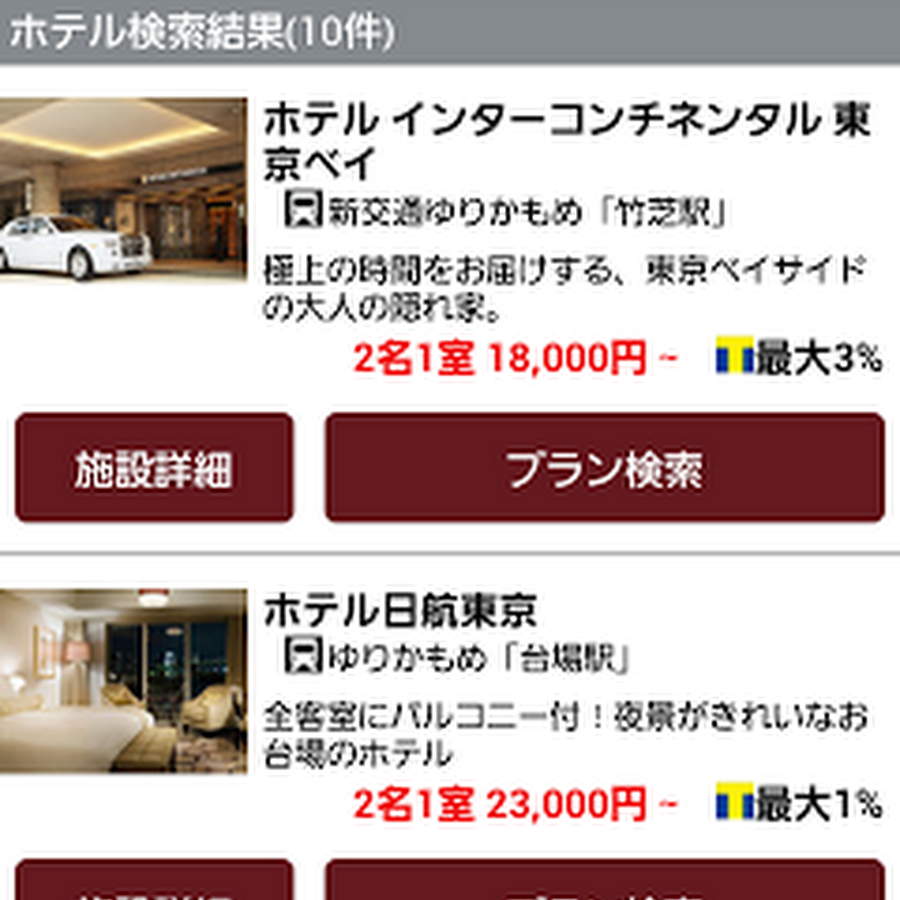 直前予約で旅館・ホテルが大幅割引 格安旅行の宿泊予約. トクー!(Tocoo!)では直前予約・直前割で旅館・ホテルが激安・格安で予約できます。全て最低価格を保証します。1泊109円で泊まれるプランや直前予約で90%オフになるお得なプランなど、日本全国でご利用いただけます。. Hypertimetable ハイパー時刻表&ホテル情報. 国内線時刻表、新幹線時刻表、国内ホテル、海外ホテル、国際線時刻表を検索、予約できます。出張、旅行、観光にご利用. ホテルでポン!|格安ビジネスホテル・人気温泉宿検索. ホテルでポン(ほてるでぽん)!日本全国の激安ビジネスホテル、おすすめの温泉旅館や民宿・ペンション・コテージなどの格安宿泊プランをじゃらん・楽天トラベルから検索・予約できます。. 東京ディズニーシー・ホテルミラコスタ® 宿泊予約は[一休]. 東京ディズニーシー・ホテルミラコスタ® 宿泊予約は[一休] 冒険の余韻をそのままに・・・。パークに滞在できるディズニーホテル。. 国内ホテル・旅館を格安予約!28社のホテル予約【h.I.S.旅プロ】. 【H.I.S.旅プロ】日本最大級の国内ホテル予約サイト!28社の最安値で、格安ホテル・高級ホテル・温泉宿など約30000軒が比較可能!.